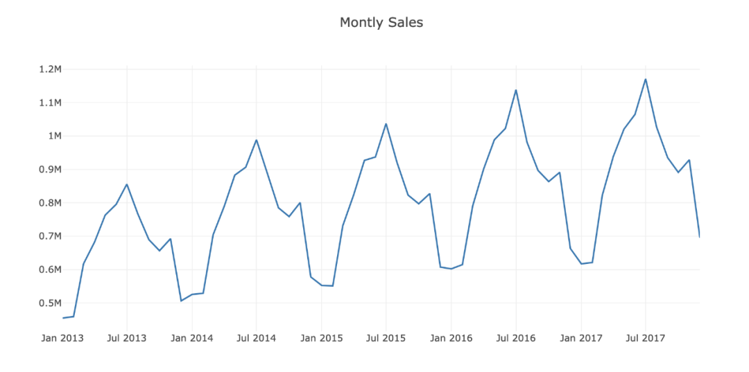 #plot monthly salesplot_data = [go.Scatter(x=df_sales['date'],y=df_sales['sales'],)]plot_layout = go.Layout(title='Montly Sales')fig = go.Figure(data=plot_data, layout=plot_layout)pyoff.iplot(fig)
