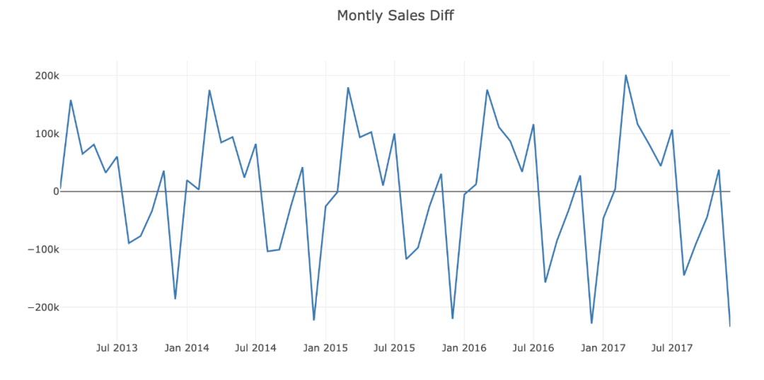 #plot sales diffplot_data = [go.Scatter(x=df_diff['date'],y=df_diff['diff'],)]plot_layout = go.Layout(title='Montly Sales Diff')fig = go.Figure(data=plot_data, layout=plot_layout)pyoff.iplot(fig)