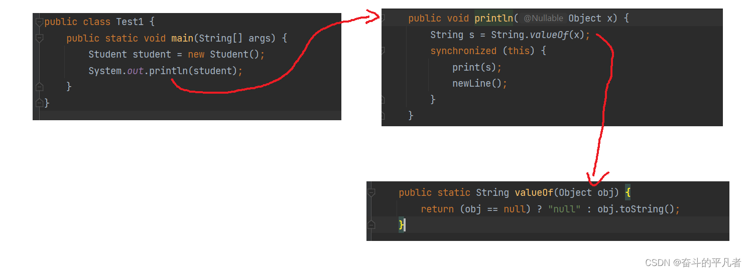 在println()函数中,用Obejcet 类 x接收了student对象,接着函数value of()有用Obejct类 obj接收了student对象。事实上,Obejct类 obj接收了student对象的过程发生了向上转型,子类Student重写了父类Object类中的to string()方法,最后obj.toString()的过程用父类调用了子类的toString()对象,发生了动态绑定的过程。 因此,最后实现了打印子类对象的过程。
