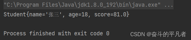 }上述代码很简单,我定义了一个Student类,并给出了其姓名,年纪和分数的初始值。并实现了to string()方法。在main函数就能打印改对象,事实上是以文本的形式表示该对象。其结果如下