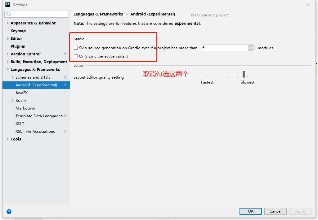 解决方案:File -> Setting -> Languages & Frameworks -> Android(Experimental) ,取消两个勾选,skip soutce...and only sync...