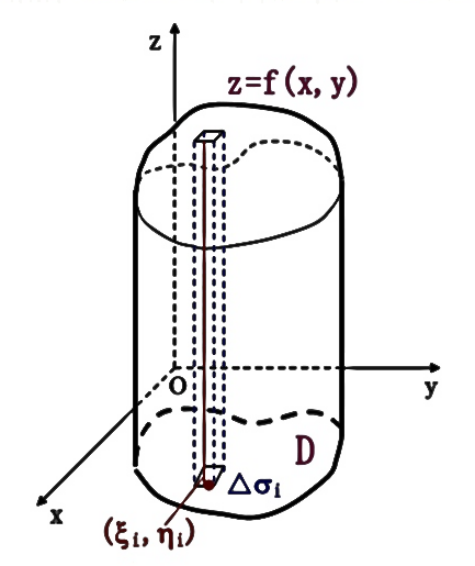 在每个∆σ中任取一点(ξi,ηi)代入z=f(x,y),得到的z作为一个小柱体的高,再求这么多个小柱体的体积之和。 - 取极限