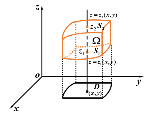 Ω是图中橙色的立体图形,将Ω分割成许多个小矩形柱体,注意,是在图中橙色立体图形中进行分割。(区域D是它在xoy面上的投影) - 求和