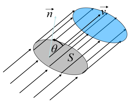 单位时间内, 流过闭区域S的流量, 其中v是沿垂直于面S的方向