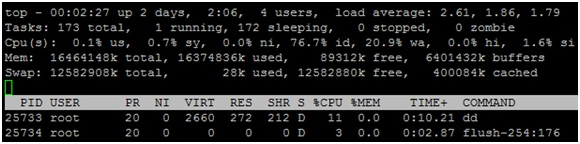 那么,我么可以通过top命令发现,buffer cache的容量越来越大,空闲内存越来越少,相当一部分内存被buffer cache占用,并且在IO操作的过程中发现bdi(flush-254:176)线程在繁忙的进行数据回刷操作。