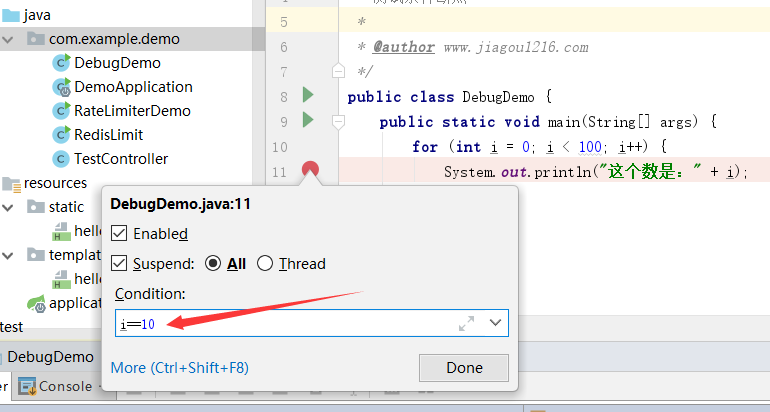 在11行处添加断点,然后右键断点“小红心”标志,弹出下面的窗口,在condition中写入i==10,点击【Done】即可。