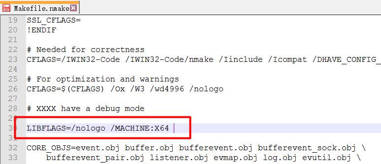 做如下修改,然后用VS2015 x64命令行工具 进行nmake /f Makefile.nmake即可。其余与32位相同