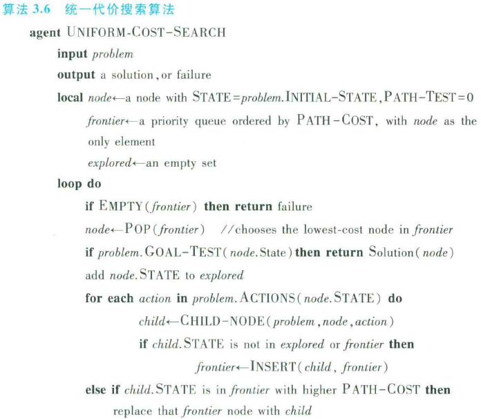 统一代价搜索是一种树搜索算法,它在扩展节点时根据问题提供的每段路径代价,寻找一条从起始节点至目标的代价最低的路径。