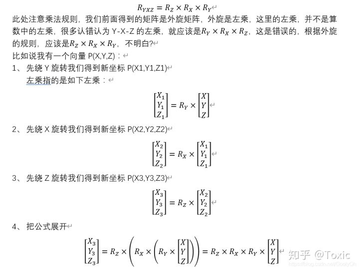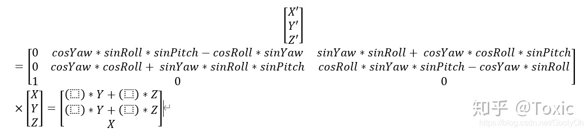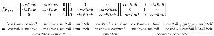 但是内旋的右乘就是从左到右乘了,从这里也可以看出左乘的Y-X-Z等于右乘的Z-X-Y了。