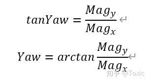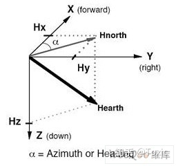 实际上对水平方向的两个分量来说,他们的矢量和总是指向磁北的。罗盘中的航向角(Azimuth)就是当前方向和磁北的夹角。由于罗盘保持水平,只需要用磁力计水平方向两轴(通常为X轴和Y轴)的检测数据就可以用如下公式计算出航向角。当罗盘水平旋转的时候,航向角在0°~ 360°之间变化。