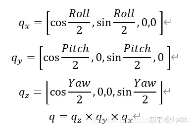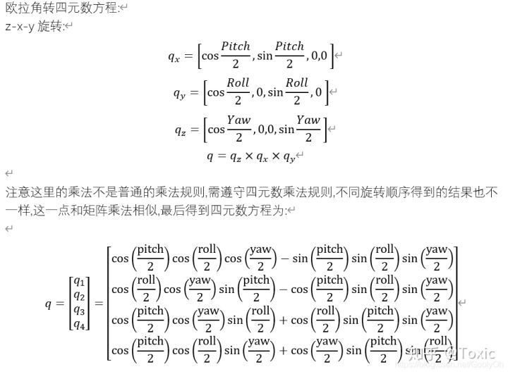 注意:这里的乘法不是普通的乘法规则,需遵守四元数乘法规则,不同旋转顺序得到的结果也不一样,这一点和矩阵乘法相似,最后得到四元数方程为: