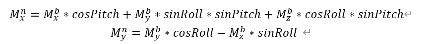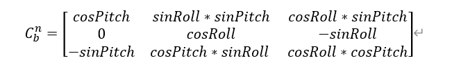 实际情况下但是我们不能保证当前载体绝对水平,所以我们需要把传感器的数据转换到水平面。这里就要用到当前飞机的姿态角了,我们通过DCM矩阵来完成从载体系到参考系的转换,我们需要的是参考系下的水平分量。 通过矩阵来表达也就是: