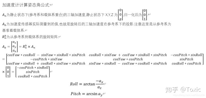 注意:由于IMU的坐标系和NED不一致,所以我们要把传感器的Y轴和Z轴的值取反,乘以静止加速度向量的时候,Z轴也要取反,所以是乘以[0,0,-1],这一点很重要!不然,你计算出来的姿态角度是不对的!
