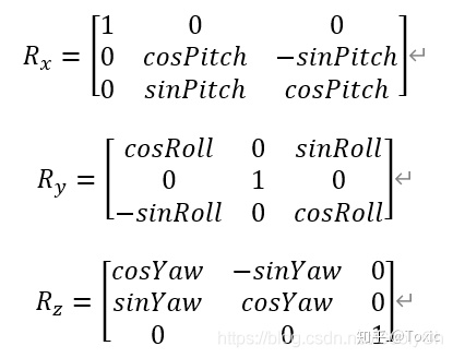 一般在ENU下我们用Z-X-Y,在NED下我们Z-Y-X旋转。 三轴基本旋转矩阵(外旋) 注意这里的三轴是外旋的,而且前面说了,这里不区分坐标系。