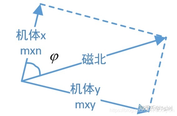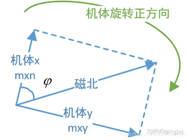 磁力计所解算的航向角是载体坐标x轴相对于磁北而言的,而真北与磁北之间存在一个磁偏角: