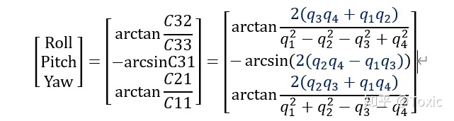 回顾一下,我们前面得到了欧拉角转DCM,现在我们有了四元数转DCM,把两者的矩阵一对应,就可以求解四元数转欧拉角的方程了。