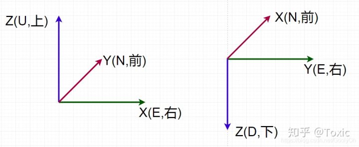在推导外旋旋转矩阵时,我们再分析一下坐标系,也就是ENU和NED,我们用图来对比一下两者有何区别: