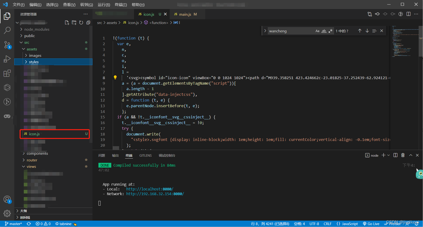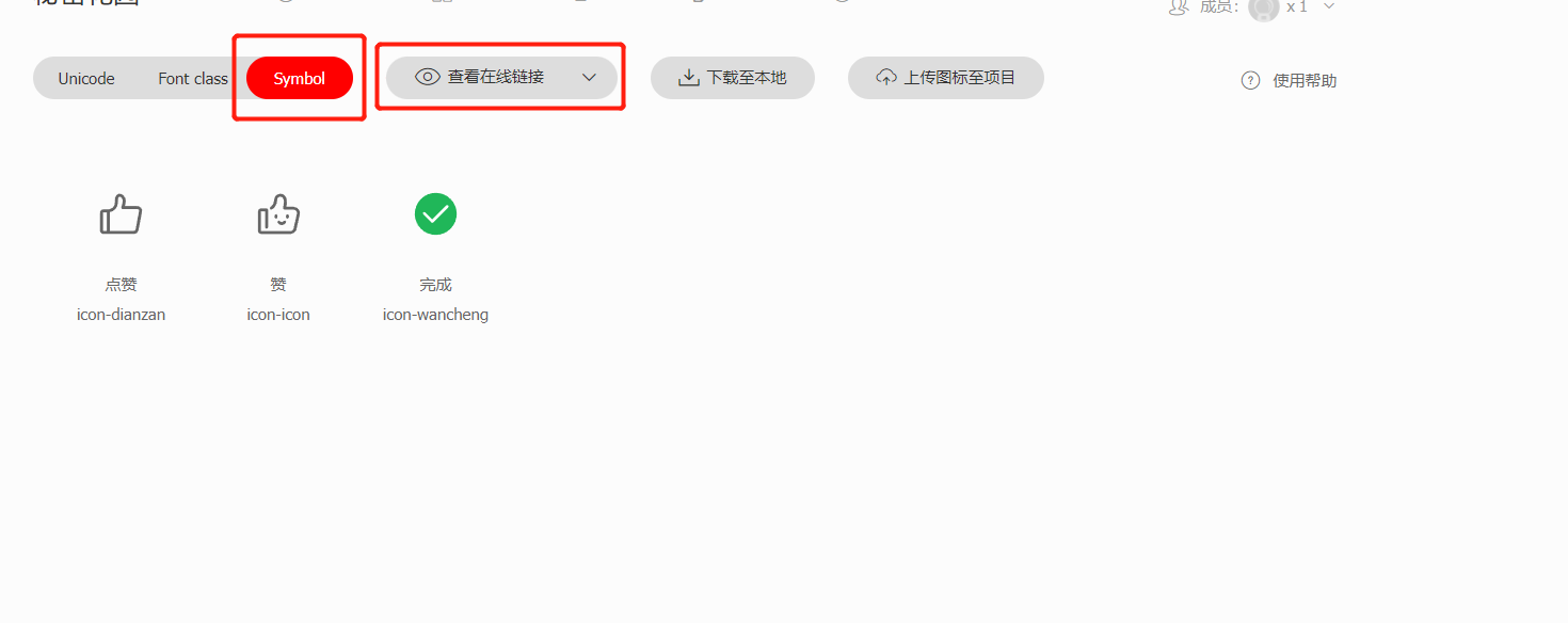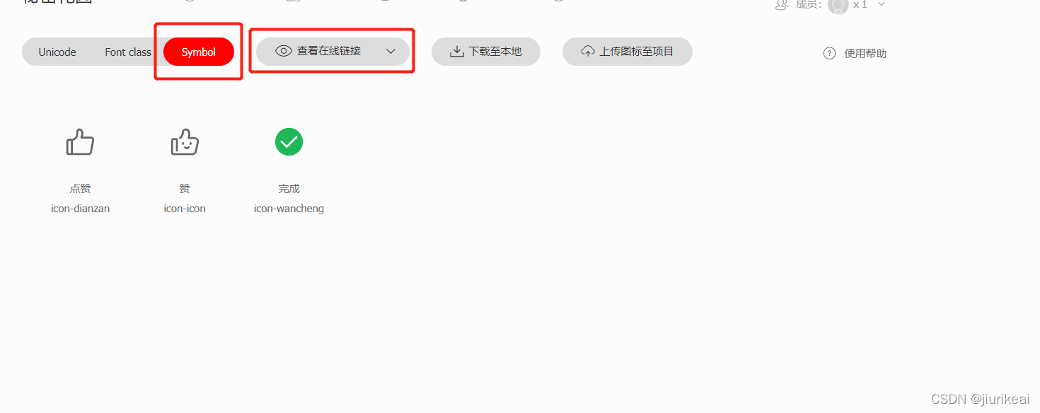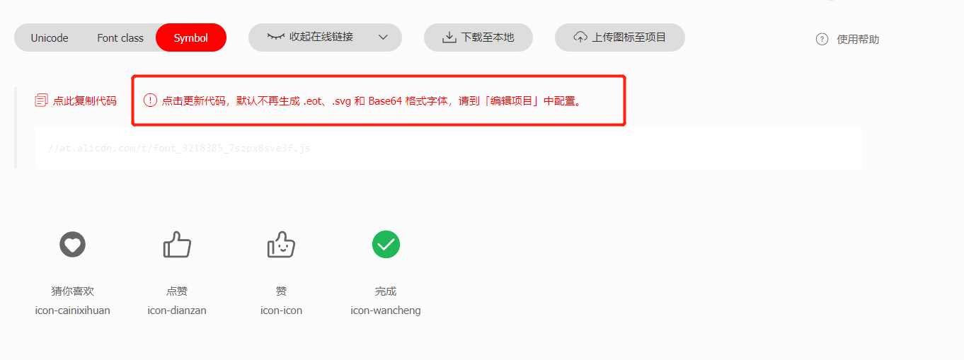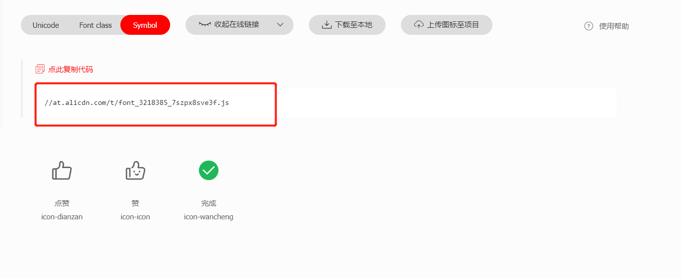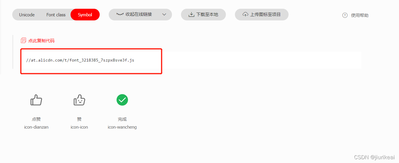 8.后续若添加新的icon图标至该项目,点击此处红字更新代码,进入在线链接全部复制后,将刚才的创建的js文件内容全部替换,无需再进行全局引入,将心仪的icon图标放至相应位置即可,代码格式详见第七条