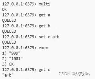 multi相当于开始事务,他不会立刻执行命令,而且将其加入队列,当你执行exec才会执行,我们看到第三条命令,c的值并不是一个值,是一个字符串,命令加入队列时并不会去检查。