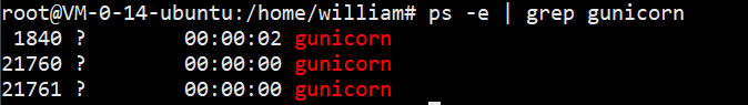nohup gunicorn -w 2 -b 127.0.0.1:5000 app:app &运行后你可以通过如下指令来查看到当前gunicorn的运行状态: