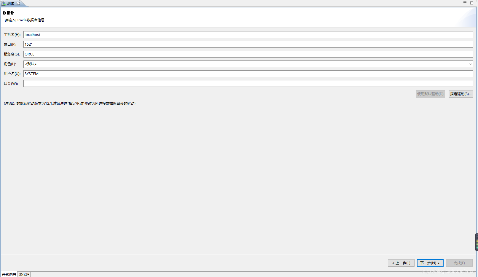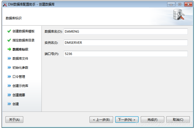 - 输入数据库标识 用户可输入数据库名称、实例名、端口号等参数。如下图所示: