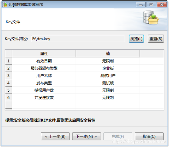 - 验证 Key 文件 用户点击“浏览”按钮,选取 Key 文件,安装程序将自动验证 Key 文件信息。如果 是合法的 Key 文件且在有效期内,用户可以点击“下一步”继续安装。如下图所示: