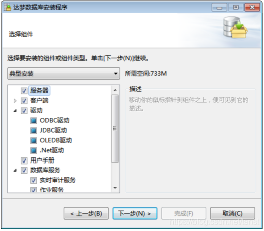 - 选择安装组件 DM 安装程序提供四种安装方式:“典型安装”、“服务器安装”、“客户端安装”和“自 定义安装”,用户可根据实际情况灵活地选择。如下图所示: 典型安装包括:服务器、客户端、驱动、用户手册、数据库服务。 服务器安装包括:服务器、驱动、用户手册、数据库服务。 客户端安装包括:客户端、驱动、用户手册。 自定义安装包括:用户根据需求勾选组件,可以是服务器、客户端、驱动、用户手 册、数据库服务中的任意组合。