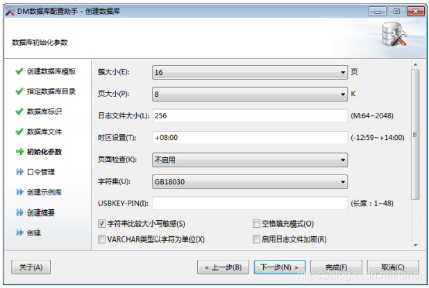 - 数据库初始化参数 用户可输入数据库相关参数,如簇大小、页大小、日志文件大小、选择字符集、是 否大小写敏感等。如下图所示: