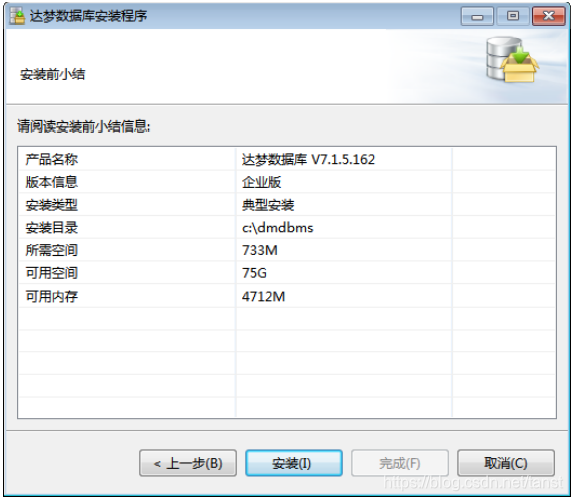 - 安装前小结 显示用户即将进行的安装的有关信息,例如产品名称、版本信息、安装类型、安装 目录、可用空间、可用内存等信息,用户检查无误后点击“安装”按钮进行 DM 的安装。 如下图所示: