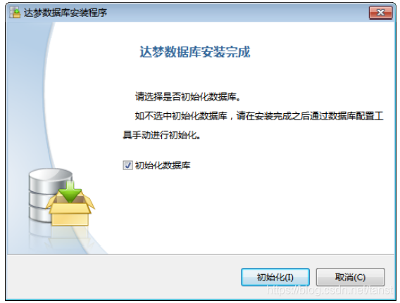 - 初始化数据库 如用户在选择安装组件时选中服务器组件,数据库自身安装过程结束时,将会提示 是否初始化数据库,如下图所示。若用户未安装服务器组件,安装“完成”后,点击完 成将直接退出。点击“取消”将完成安装,关闭对话框。