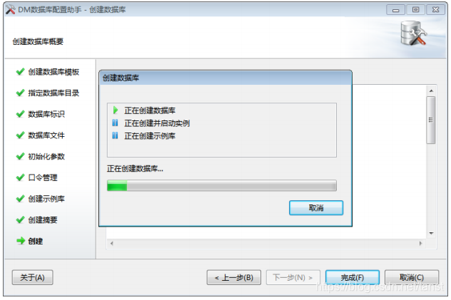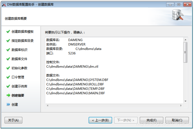 - 创建数据库摘要 在安装数据库之前,将显示用户通过数据库配置工具设置的相关参数。如下图所示: