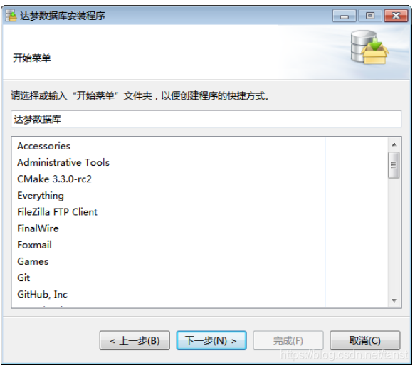 - 选择“开始菜单”文件夹 选择快捷方式在开始菜单中的文件夹名称,默认为“达梦数据库”。如下图所示:
