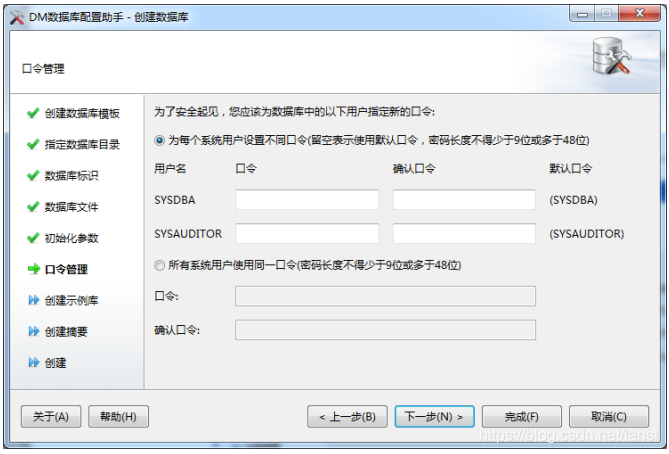 - 口令管理 用户可输入 SYSDBA,SYSAUDITOR 的密码,对默认口令进行更改,如果安装版本 为安全版,将会增加 SYSSSO 用户的密码修改。如下图所示: