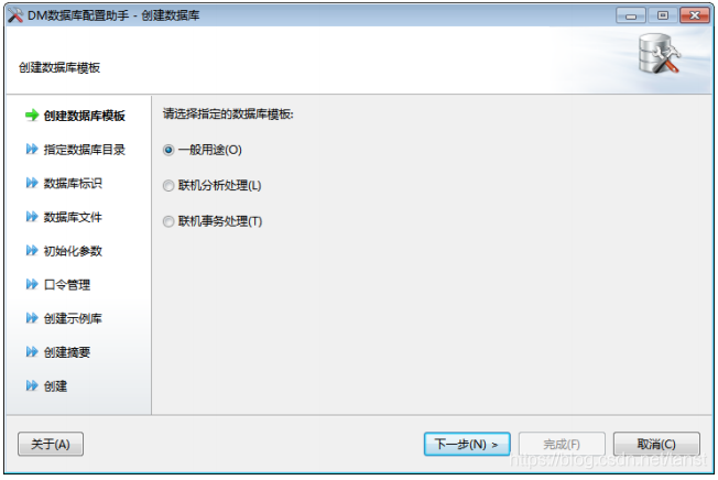 - 创建数据库模板 系统提供三套数据库模板供用户选择:一般用途、联机分析处理和联机事务处理, 用户可根据自身的用途选择相应的模板。如下图所示:
