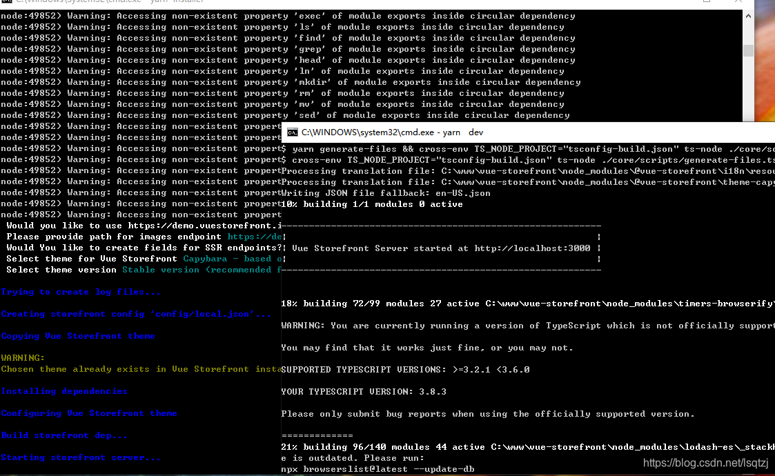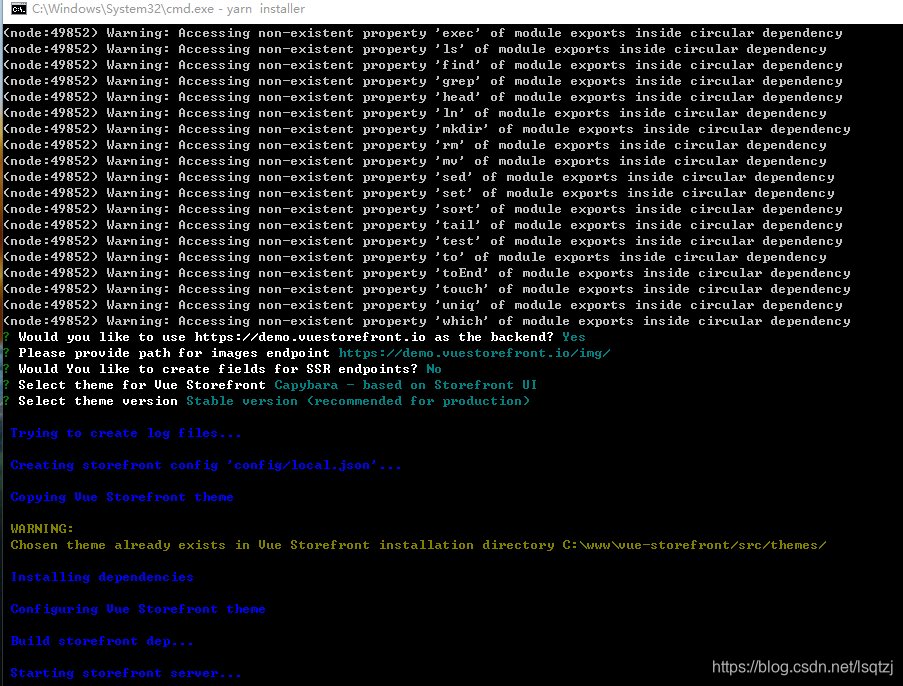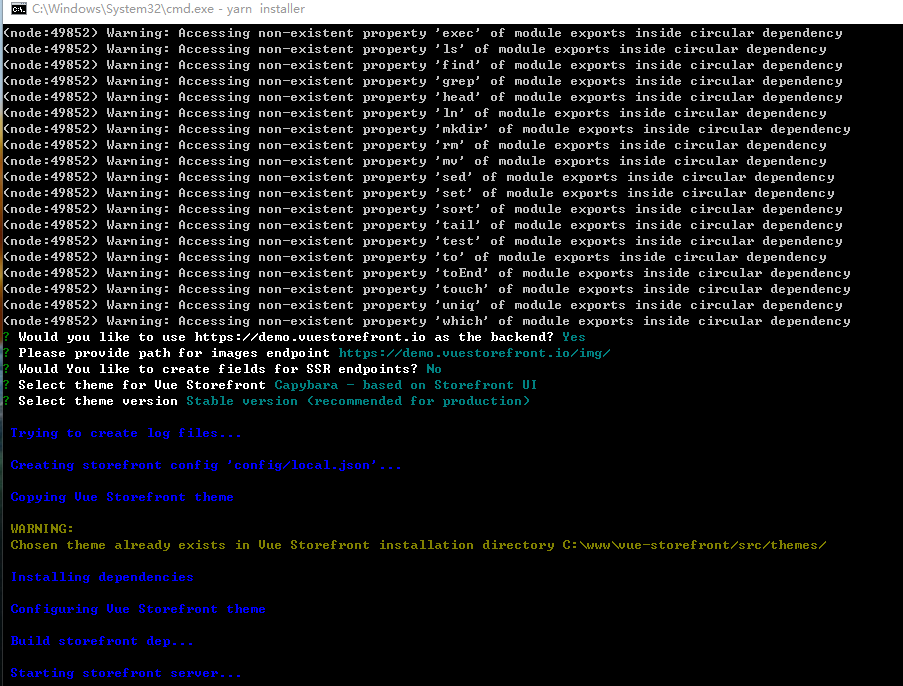 yarn installer? Would you like to use https://demo.vuestorefront.io as the backend? (Y/n) (node:37012) Warning: Accessing non-existent property 'cat' of module exports inside circular dependency