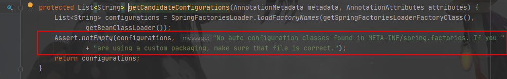 可以清晰的看到这边有一个断言, 写的就是 在META-INF/spring.factories中没有找到一条配置, 那也就是说我们的自动装配都放在了 META-INF/spring.factories中, 我们点进上面的loadFactoryNames方法
