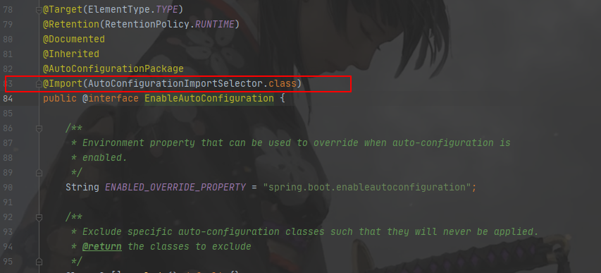 被红框框中的就是我们上面一直在介绍的@Import, 可以很明显的看到使用的是第三种方法,导入ImportSelector的实现类,我们点进这个实现类继续看