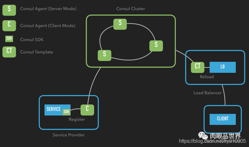 所幸通过Consul Template,可以定时从Consul集群获取最新的服务提供者列表并刷新LB配置(比如nginx的upstream),这样对于服务调用者而言,只需要配置一个统一的服务调用地址即可。