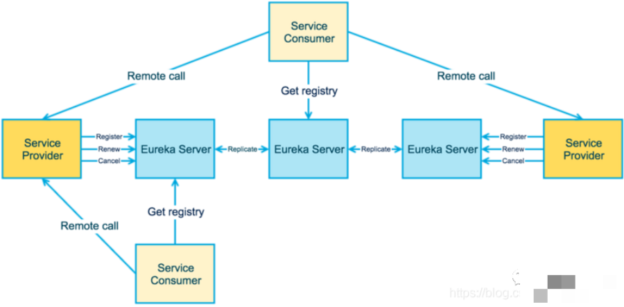 在集群环境中如果某台 Eureka Server 宕机,Eureka Client 的请求会自动切换到新的 Eureka Server 节点上,当宕机的服务器重新恢复后,Eureka 会再次将其纳入到服务器集群管理之中。当节点开始接受客户端请求时,所有的操作都会在节点间进行复制(replicate To Peer)操作,将请求复制到该 Eureka Server 当前所知的其它所有节点中。