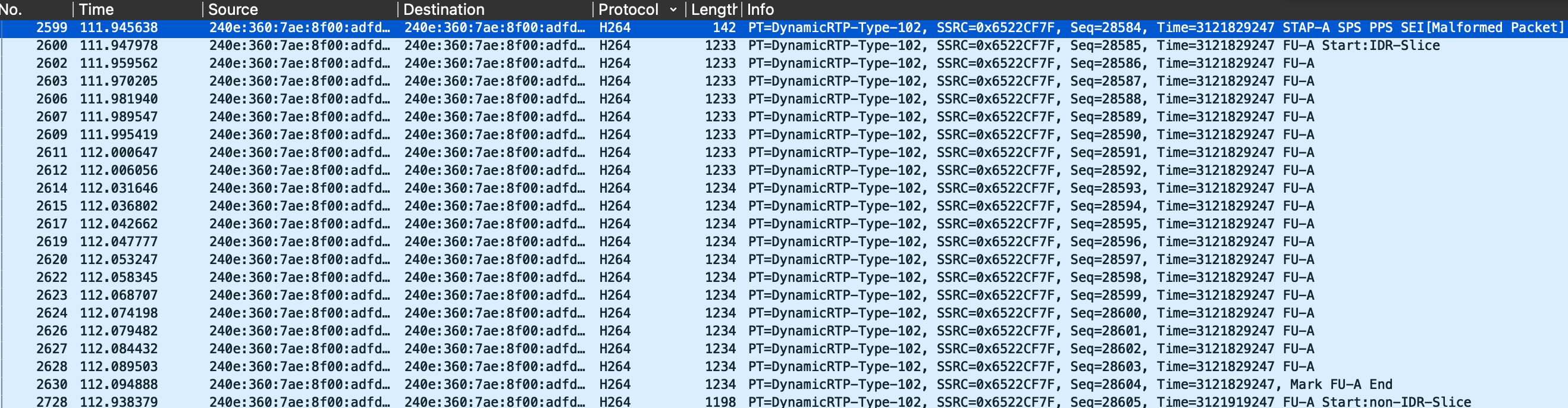 2.用wireshark抓取H264视频码流,最好过滤掉其他码流