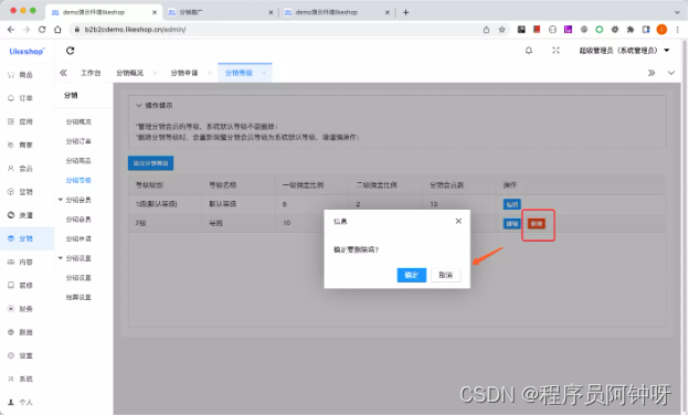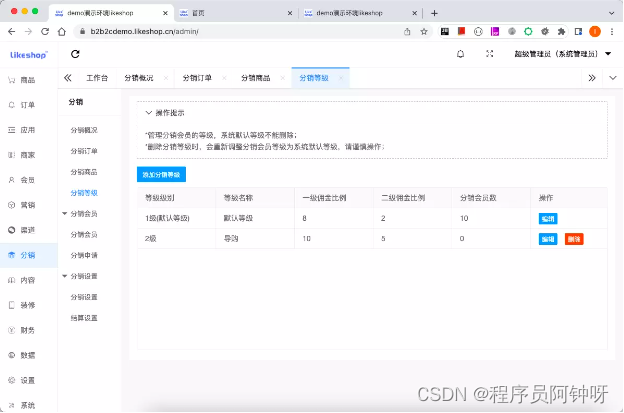 分销等级可以删除,系统默认的分销等级则不能删除。删除分销等级时,会重新调整分销会员等级为系统默认分销等级,请谨慎操作。
