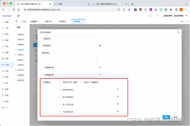 等级条件表示推荐人升级到该分销等级时需要满足的条件。条件有: