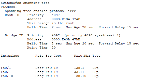 SwitchA(config)#spanning-tree vlan 1 priority 4096