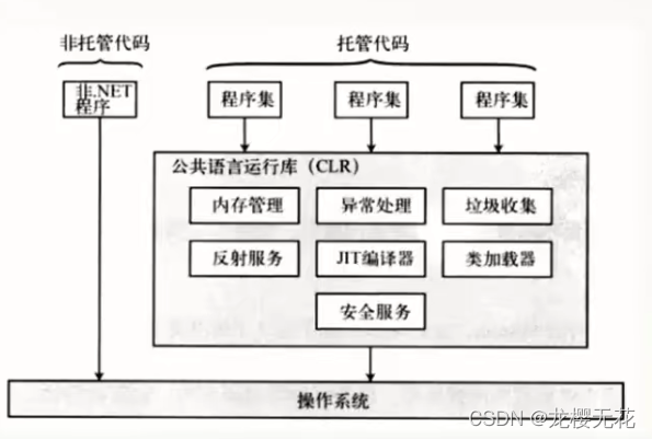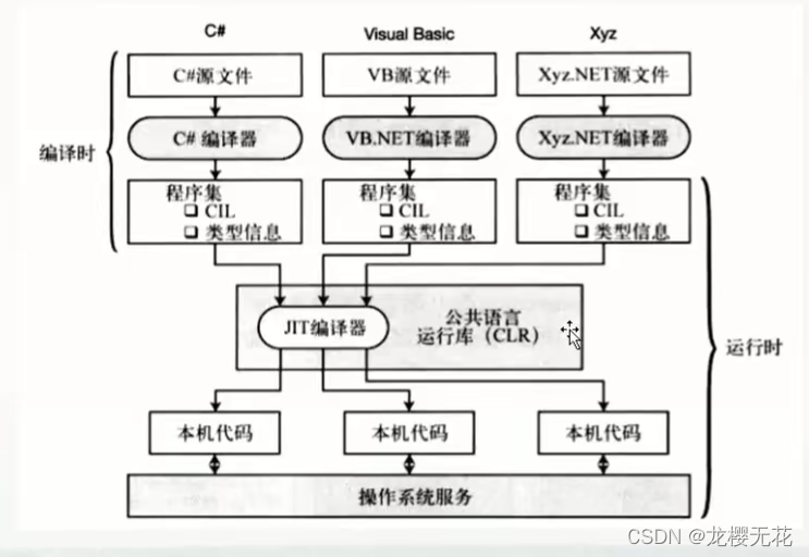 程序集->JIT编译器(解析)->本机代码->操作系统服务。