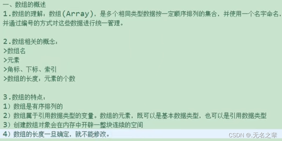 - 声明和初始化:数组一旦初始化完成,其长度就确定了,中括号[]可以放到变量名的后面