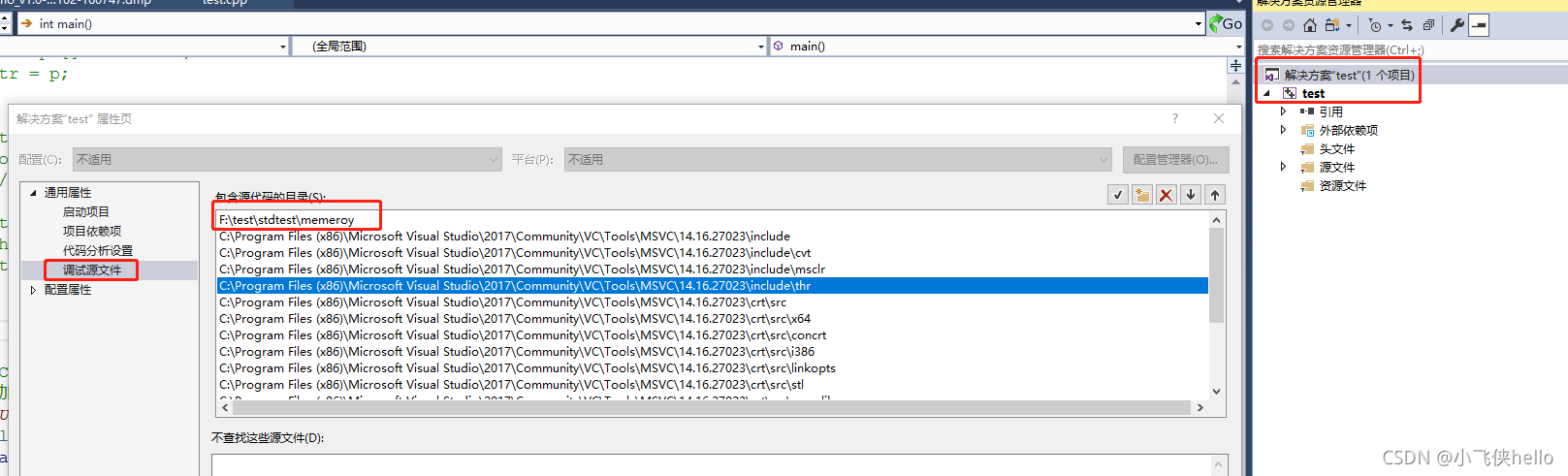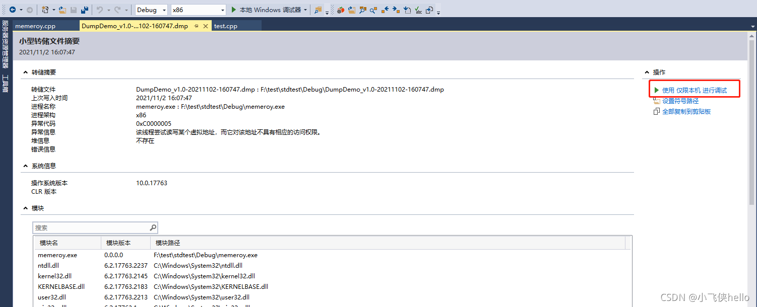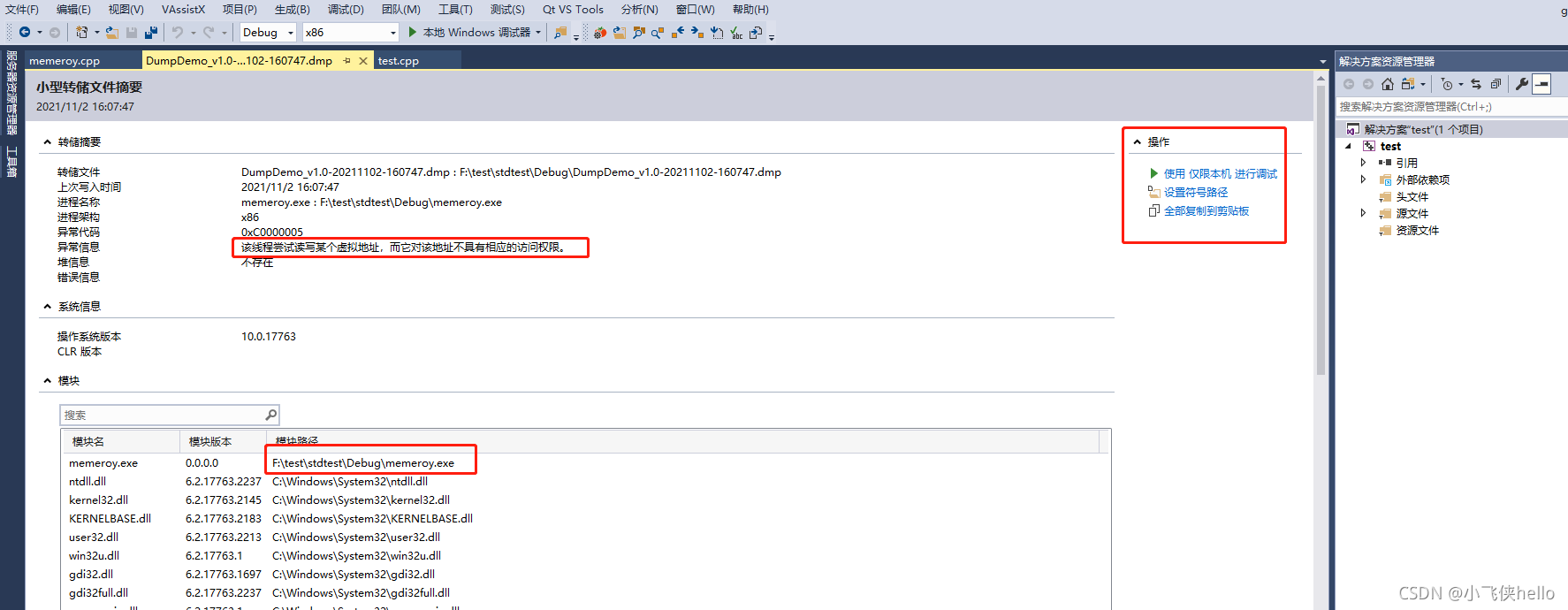 test是随便一个工程。而memory才是出现崩溃的工程。就是出现崩溃的程序的源码导进来。