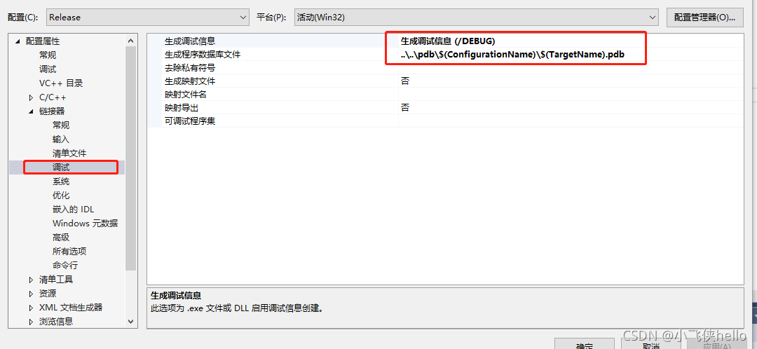 上图中,“生成调试信息”为pdb文件生成与否的使能开关,“生成程序数据库文件”为该pdb文件的名字,默认即可。