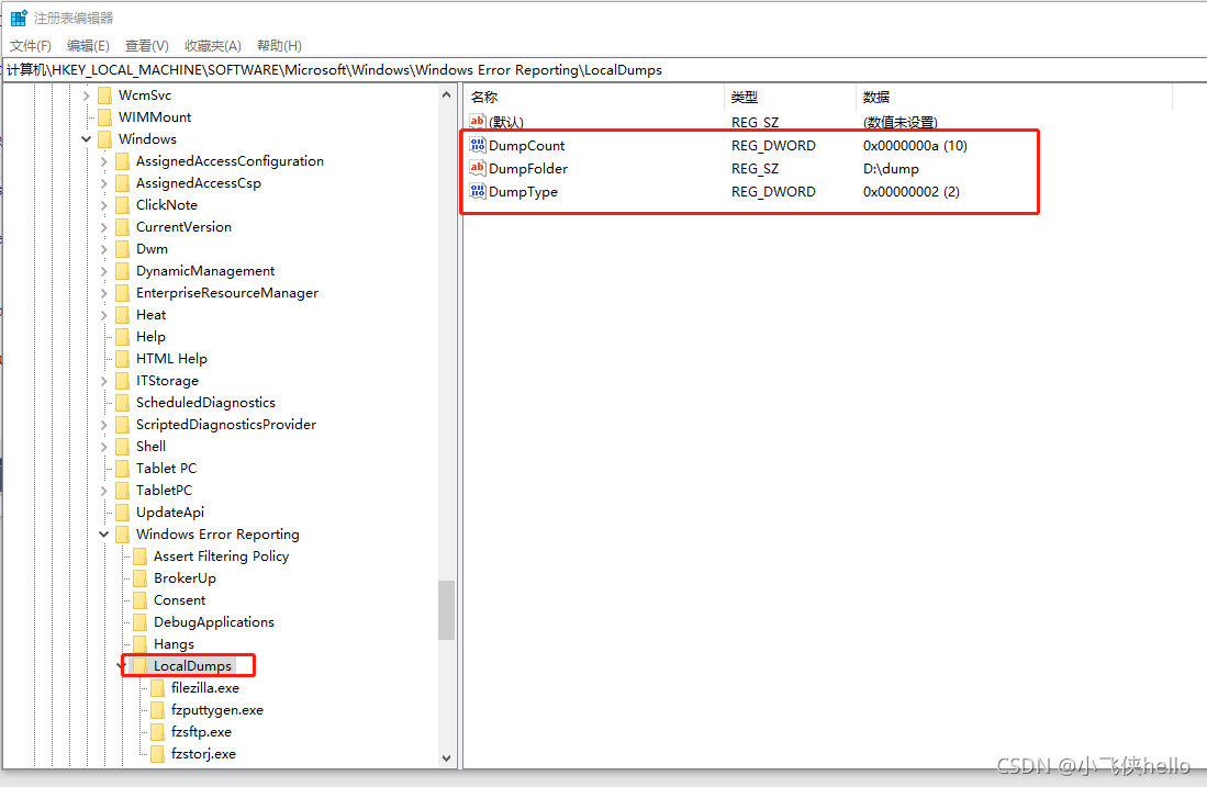 增加注册表HKEY_LOCAL_MACHINE\SOFTWARE\Microsoft\Windows\Windows Error Reporting\LocalDumps