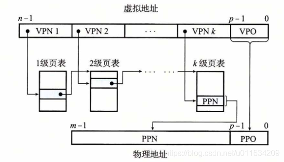 第一问:虚拟地址分为两个部分,一部分是虚页号,另一部分是页内地址(也称为页内偏移)。其中,由于虚拟内存可能存在多级页表索引。所以,虚页号还可以再划分,有多少级页表,虚页号就相应地划分多少次,如下图所示(图中,VPN表示Virtual Page Number,即虚拟页号;VPO表示Virtual Page Offset,即虚拟页内偏移;PPN表示Physical Page Number,即物理页号;PPO表示Physical Page Offset,即物理页面偏移)。