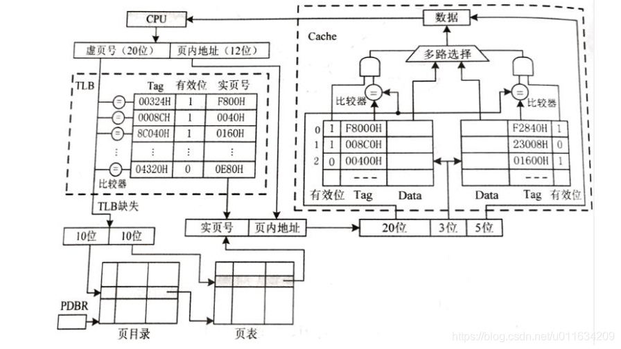 图1表明,虚页号由20位构成,页内地址由12位构成。其中,虚页号分为两部分,页目录号占10位,页表号占10位。